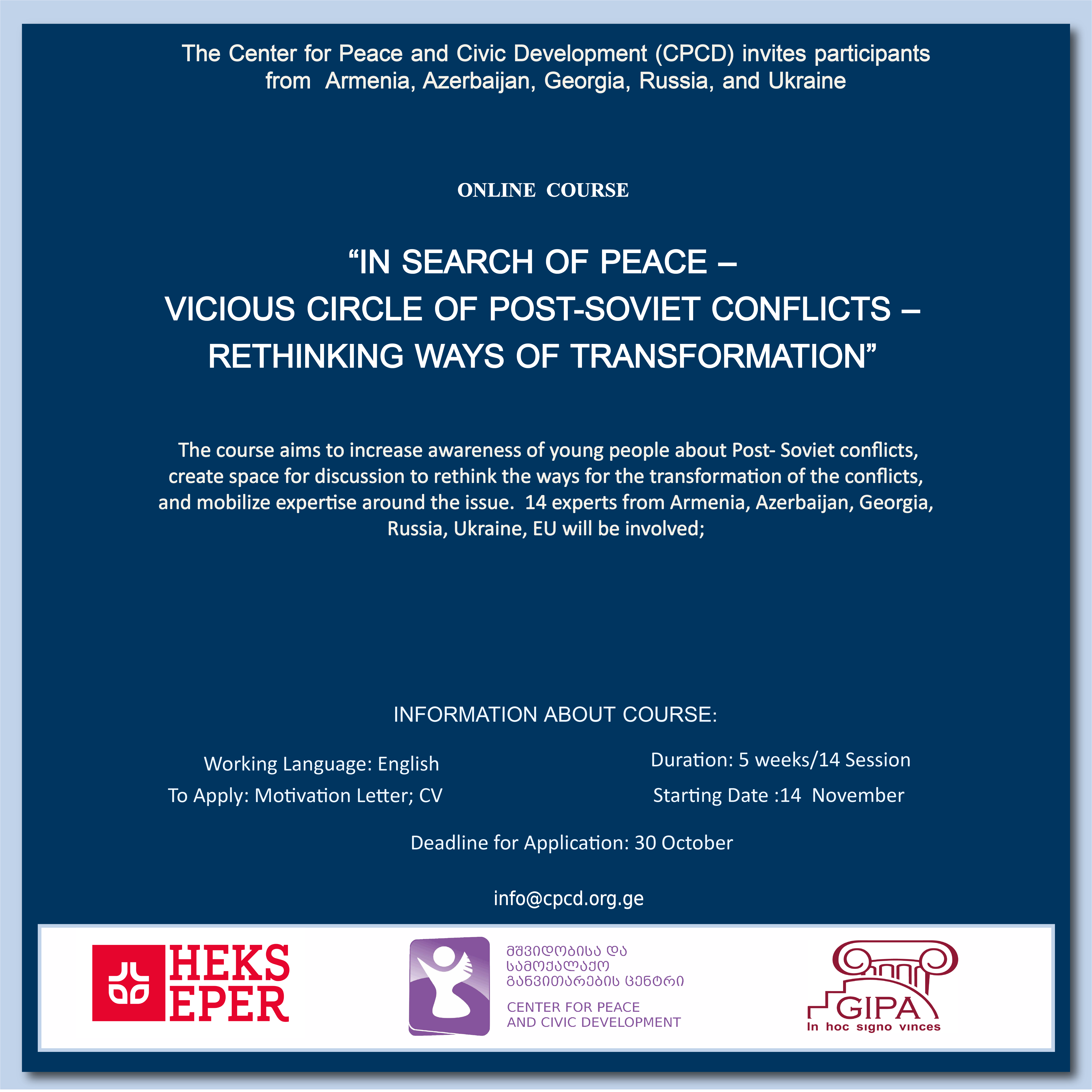 The Center for Peace and Civic Development (CPCD) in cooperation with the Georgian Institute of Public Affairs (GIPA) in the frames of the project “Youth for Peace in the South Caucasus” is launching an online course “In Search of Peace - Vicious Circle of Post-Soviet Conflicts - Rethinking Ways of Transformation”. The aim of the course is to increase awareness of young people about Post-Soviet conflicts, create space for discussion to rethink the ways for the transformation of the conflicts, and mobilize expertise around the issue. Throughout the course 14 regional and...